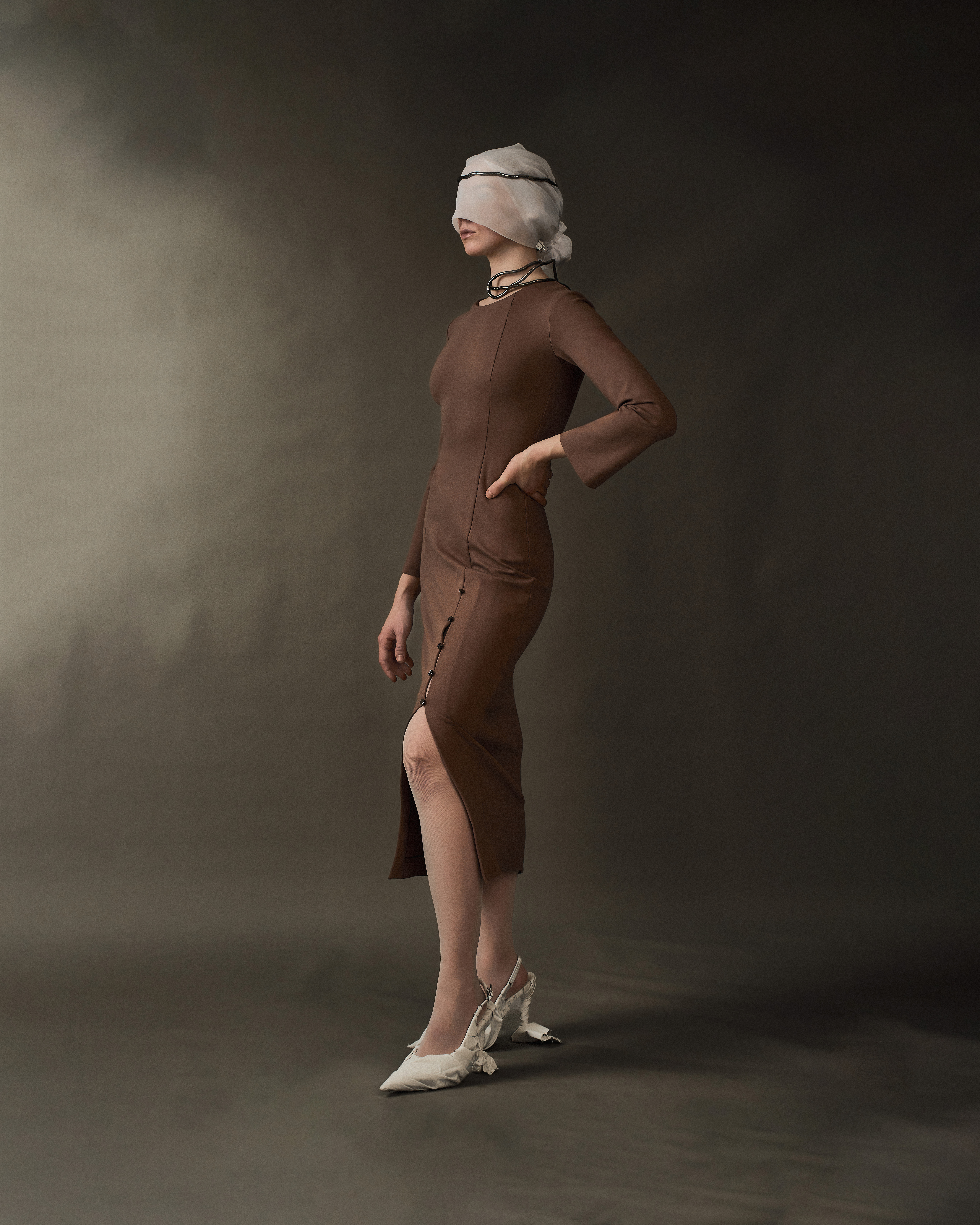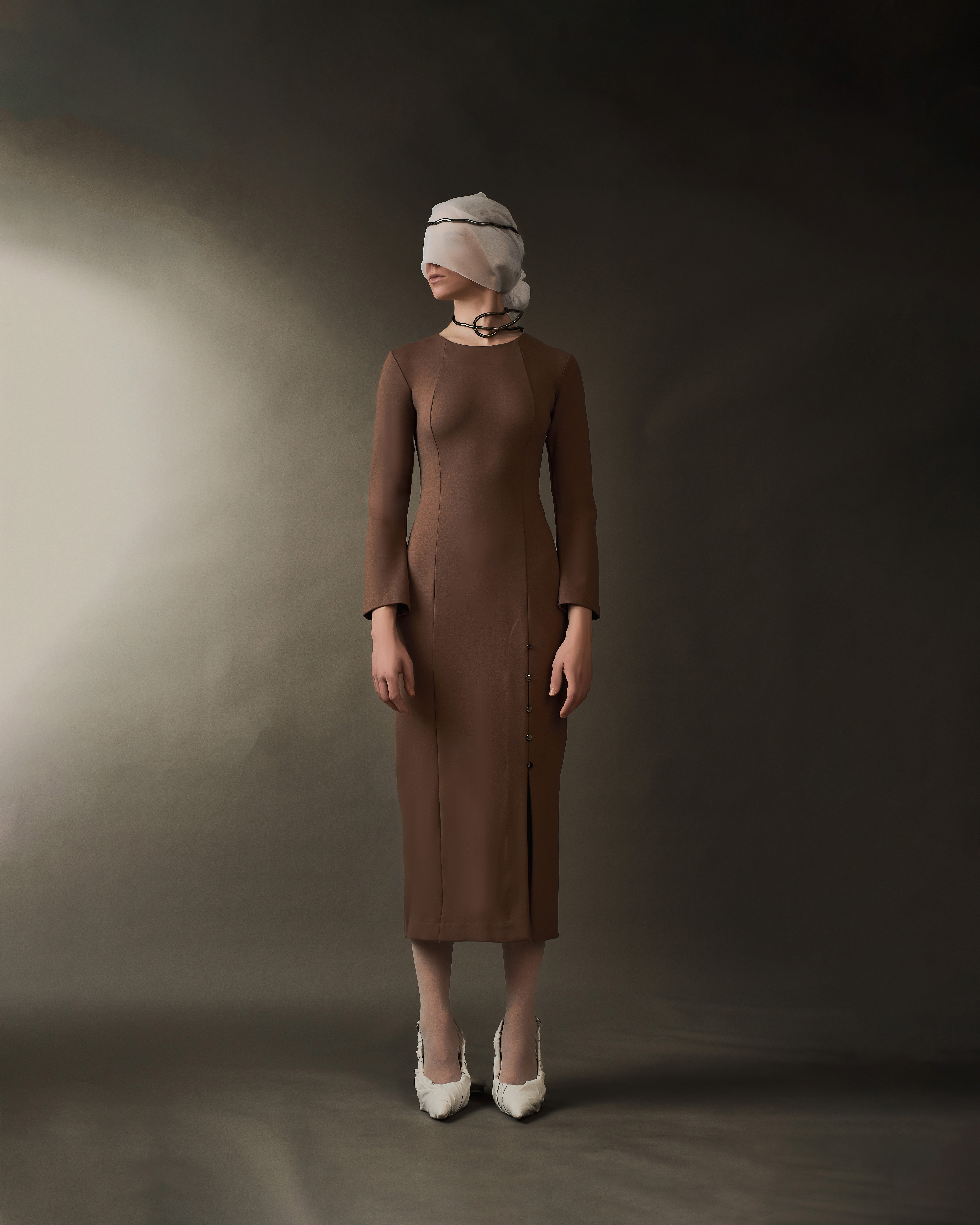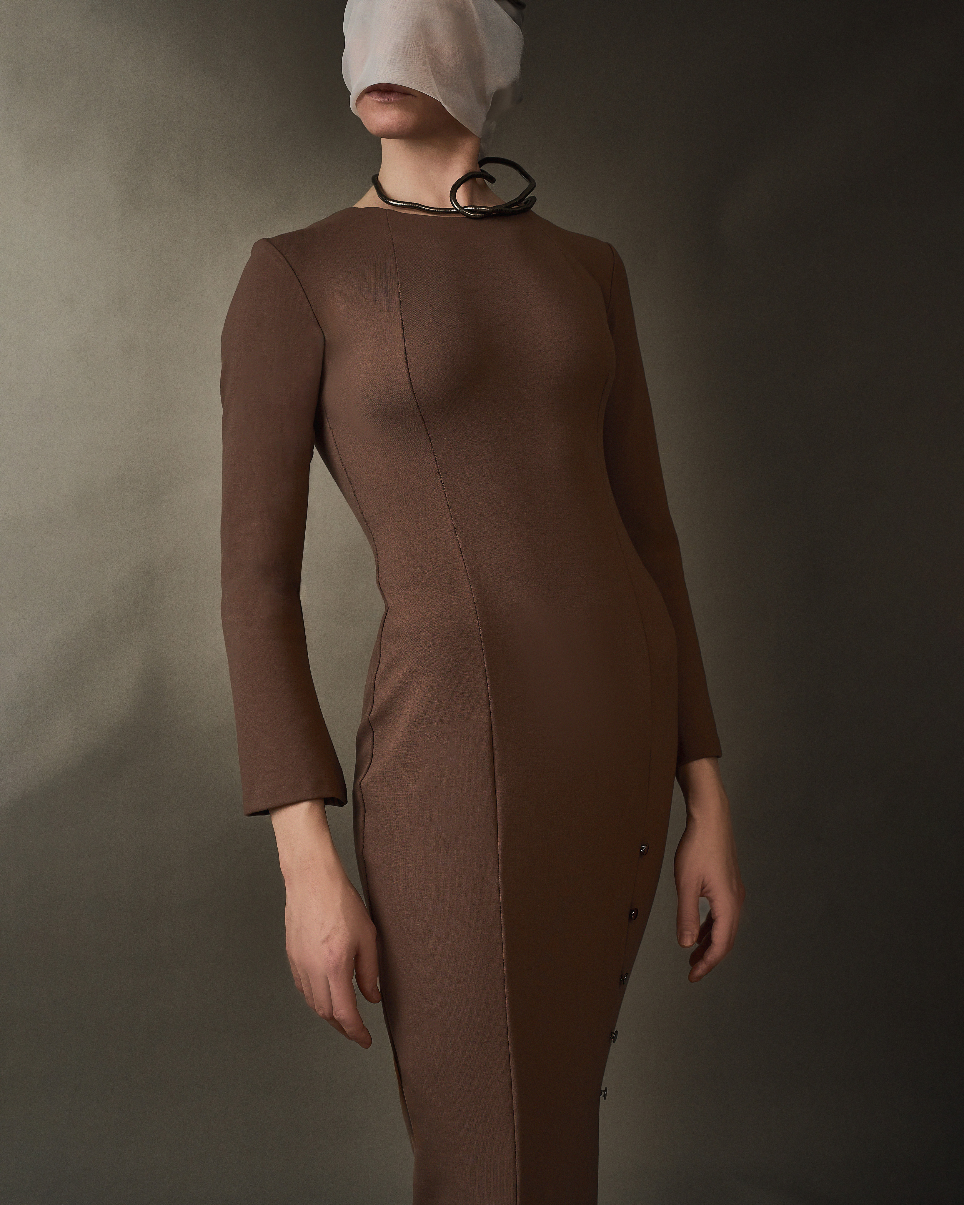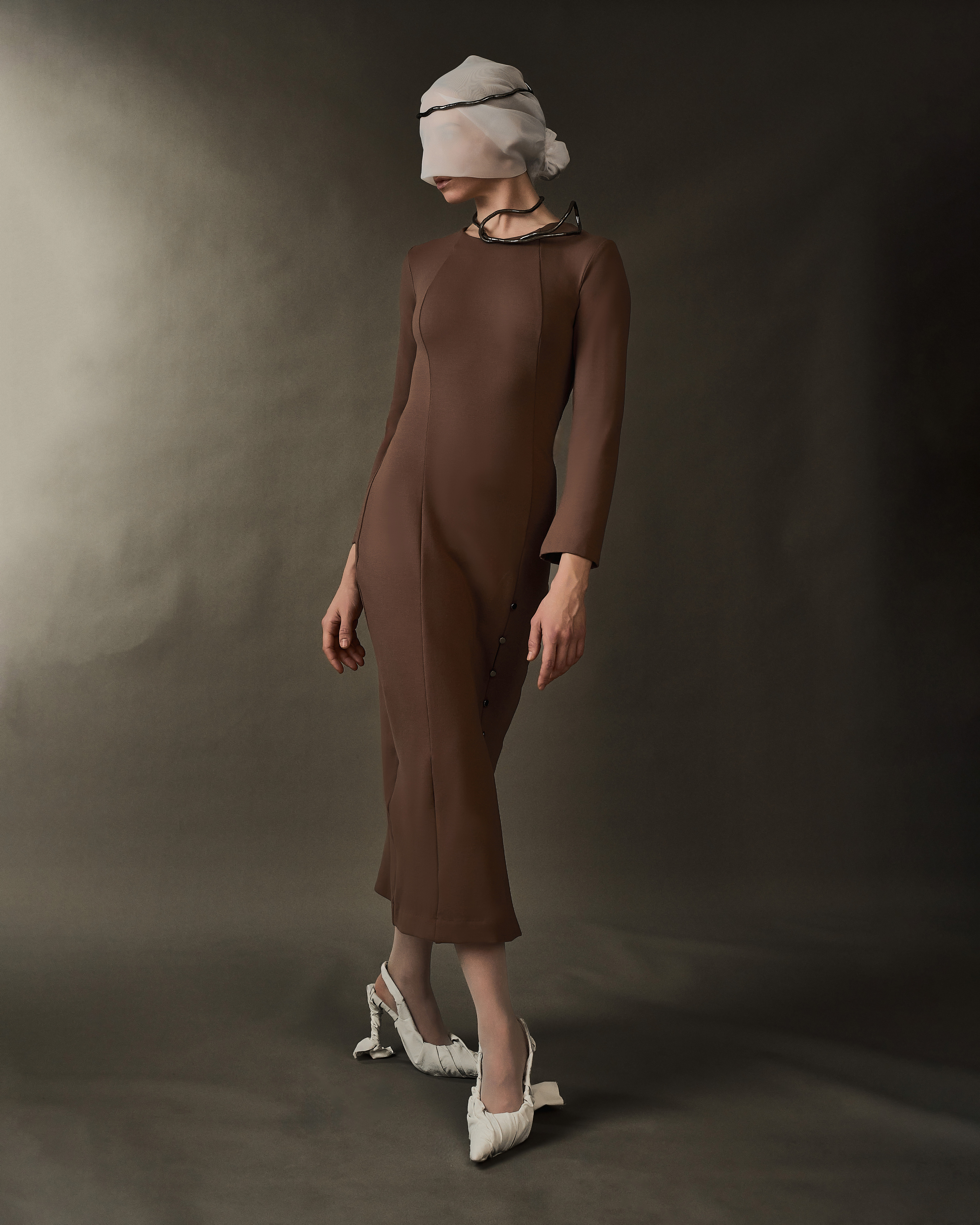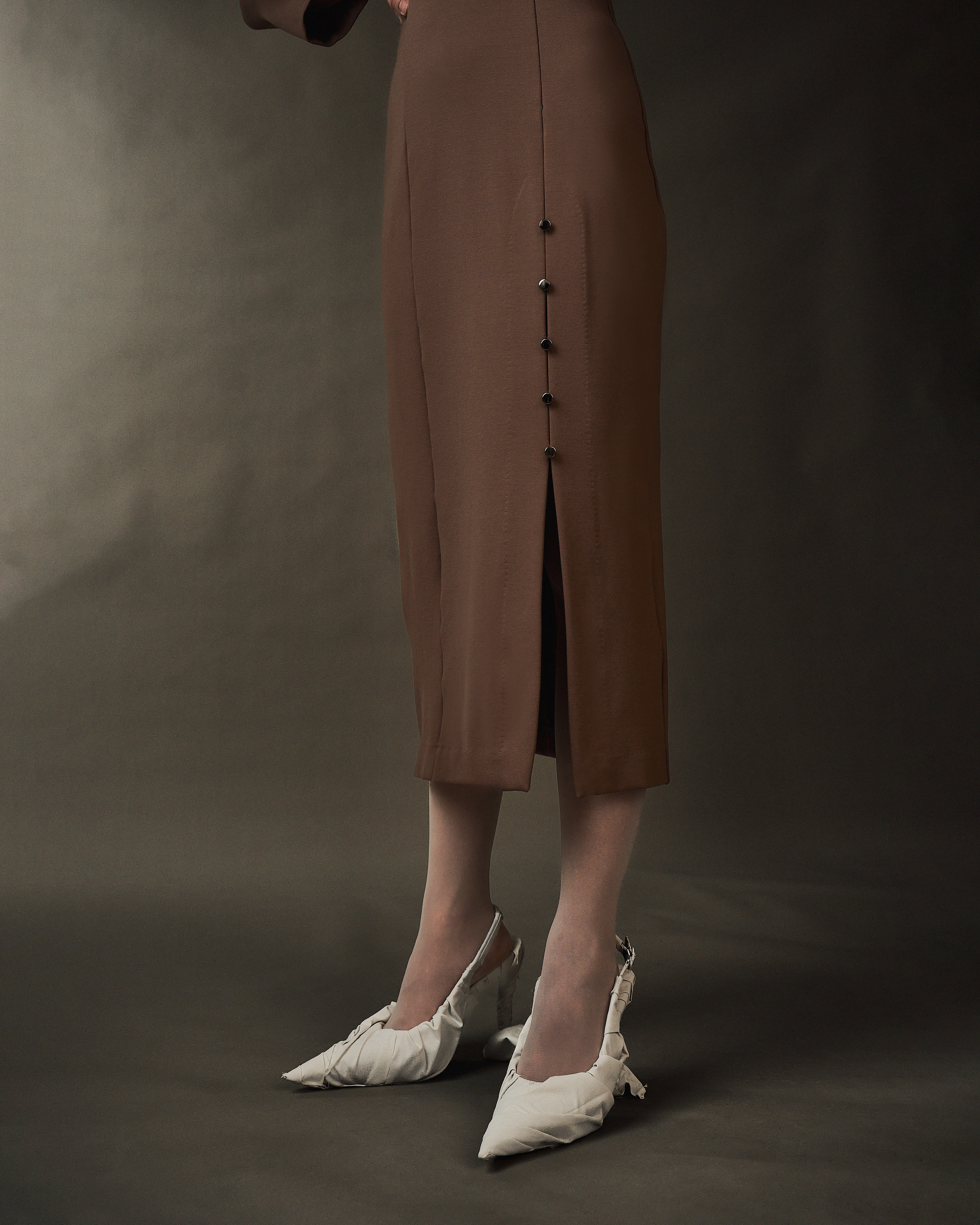 - Фурнитурная линия из 5 пуговок на одной ноге, держащие высокий разрез на крепкой потайной стежке