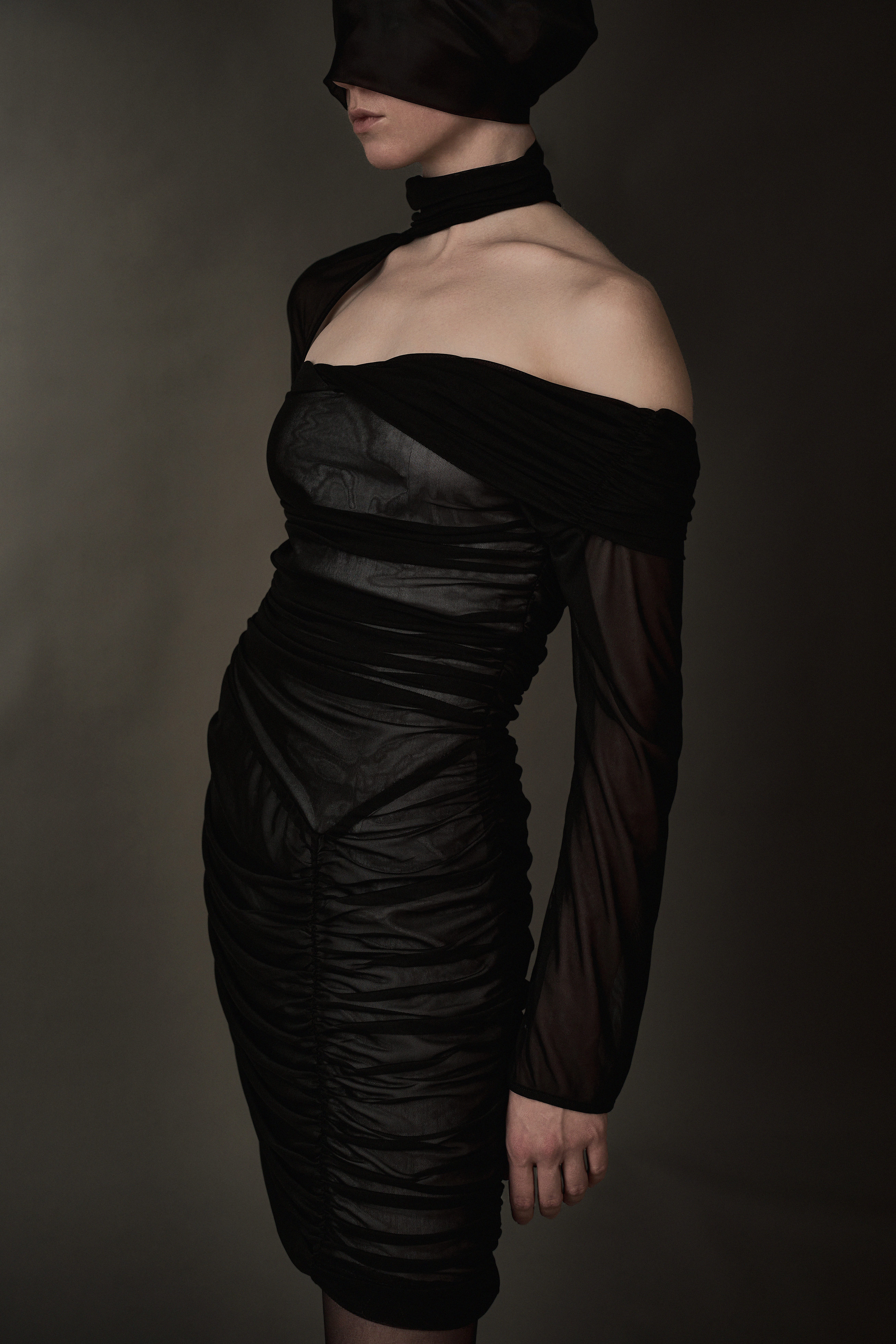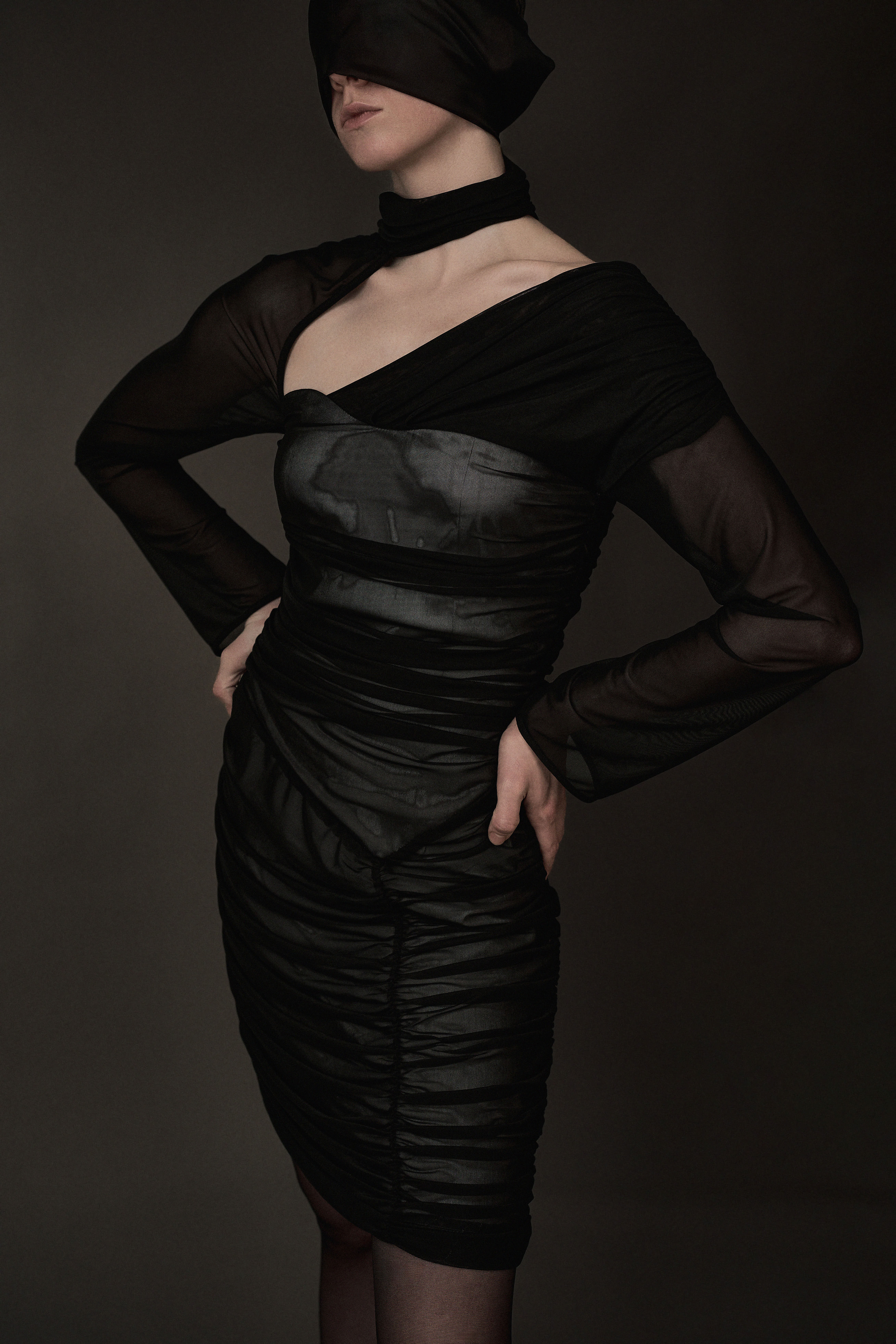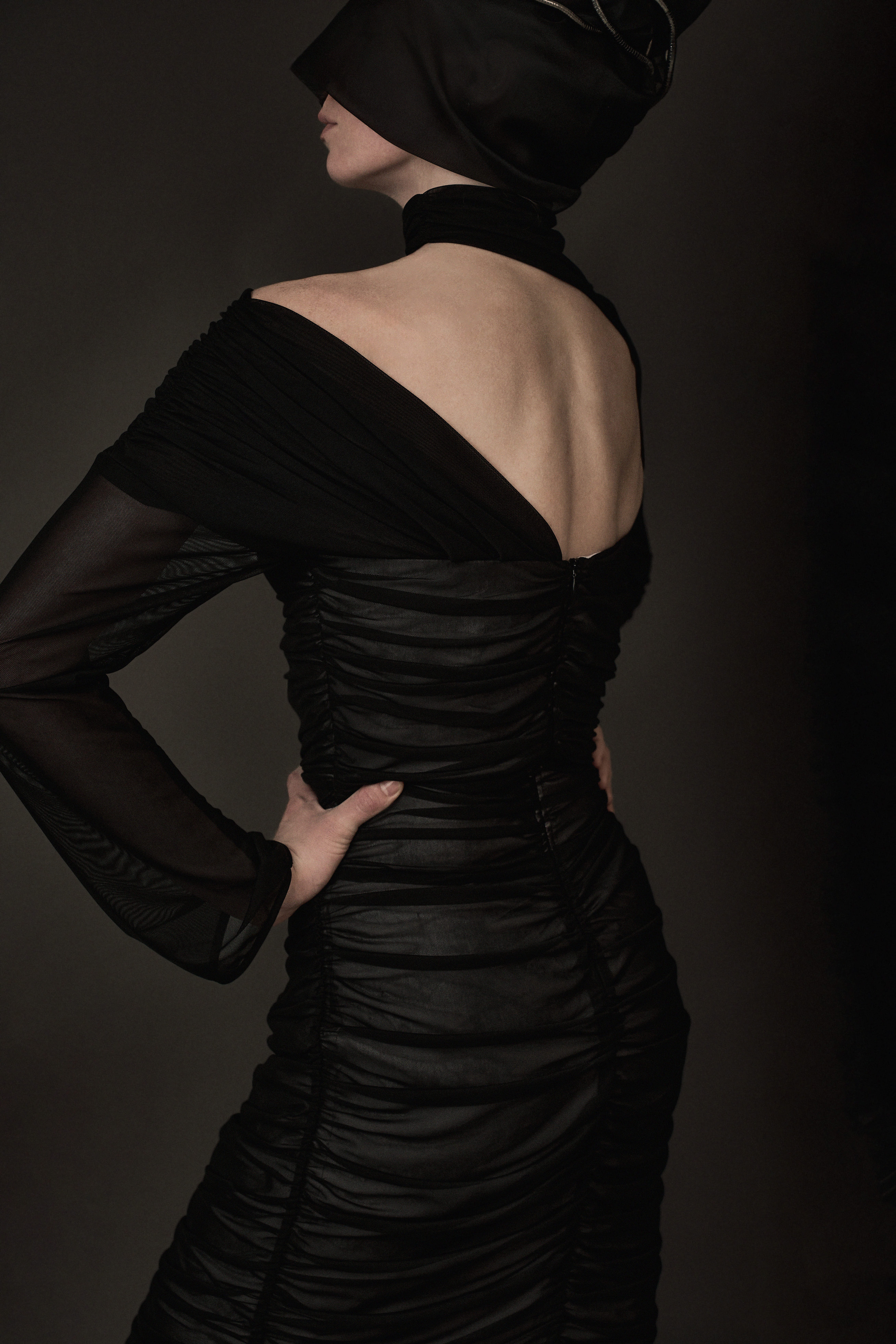 Сложнокроенное платье из двух слоев, снизу – футляр из нежного сатина по фигуре, сверху – драпированная полупрозрачная сетка, создающая воздушный визуал.
