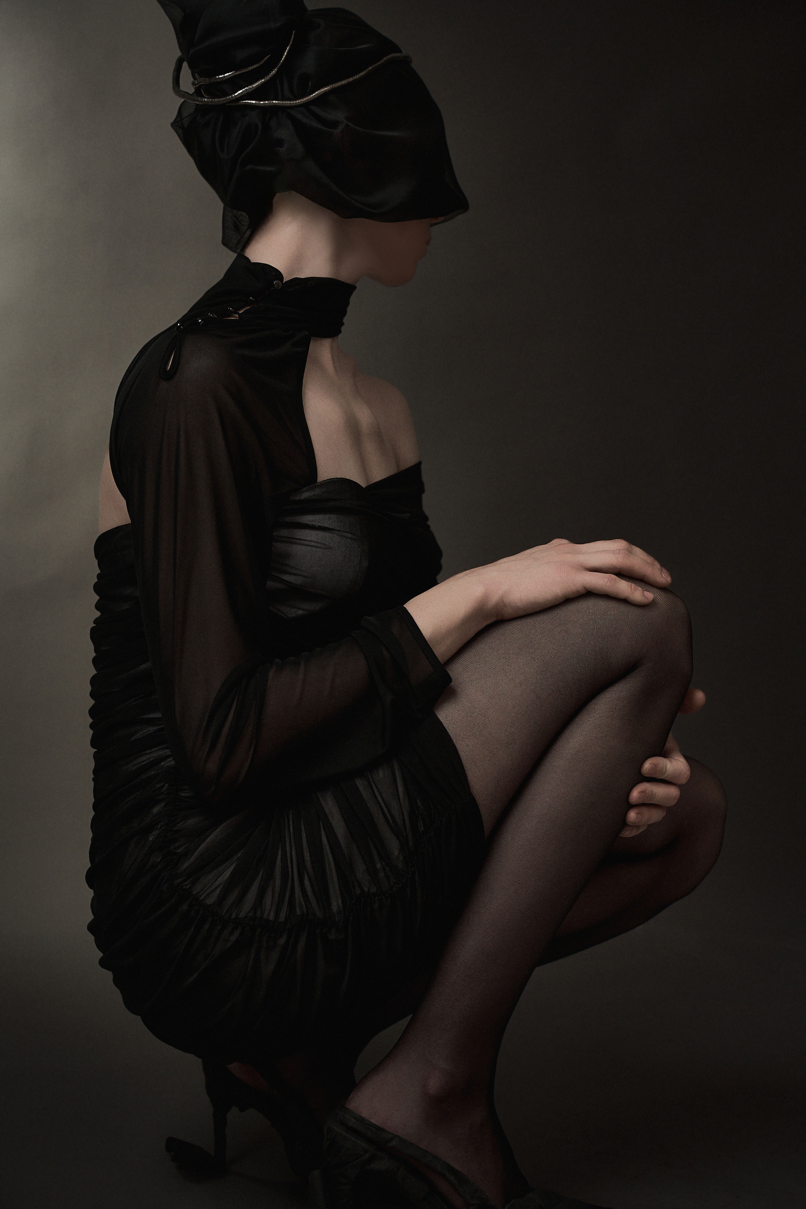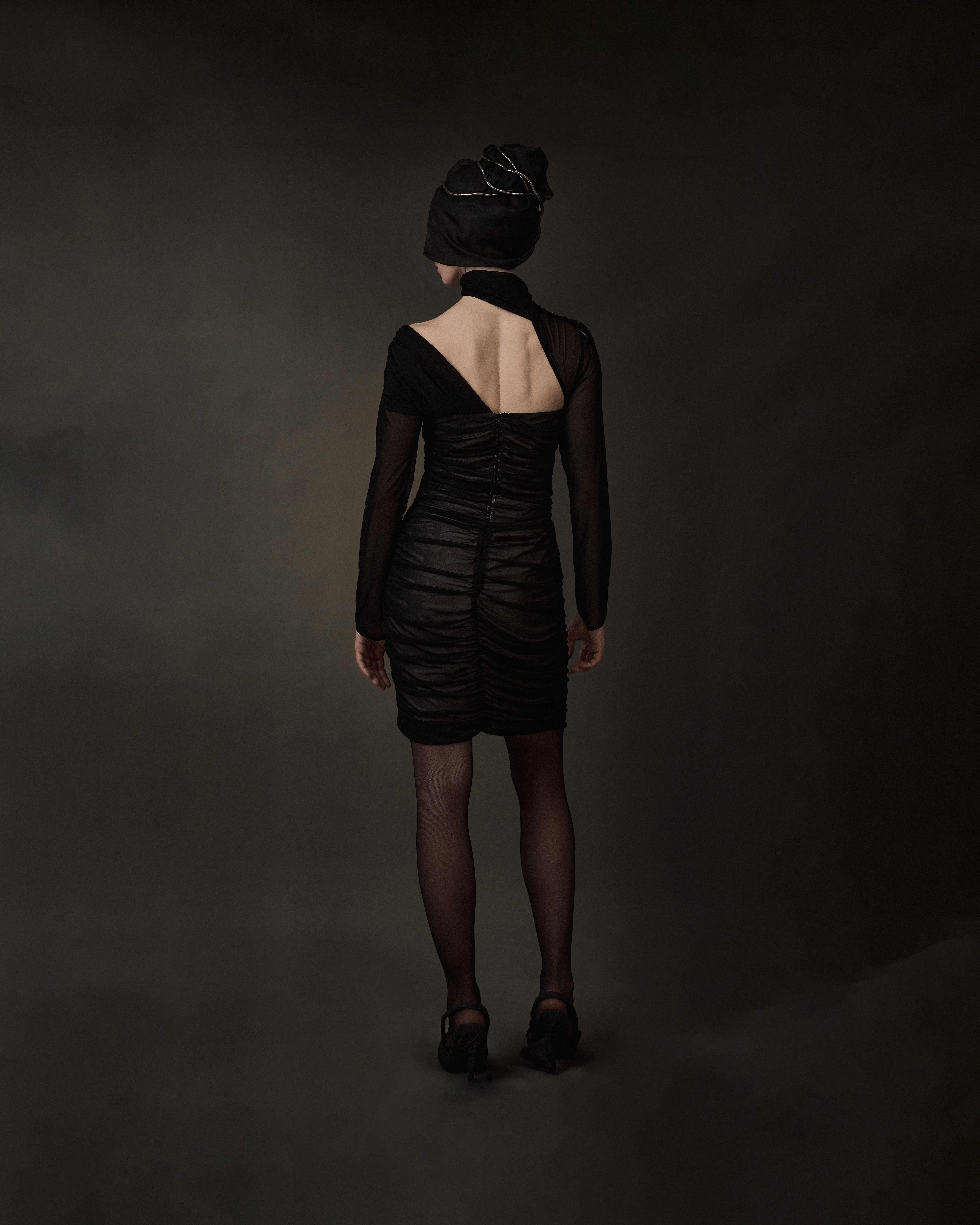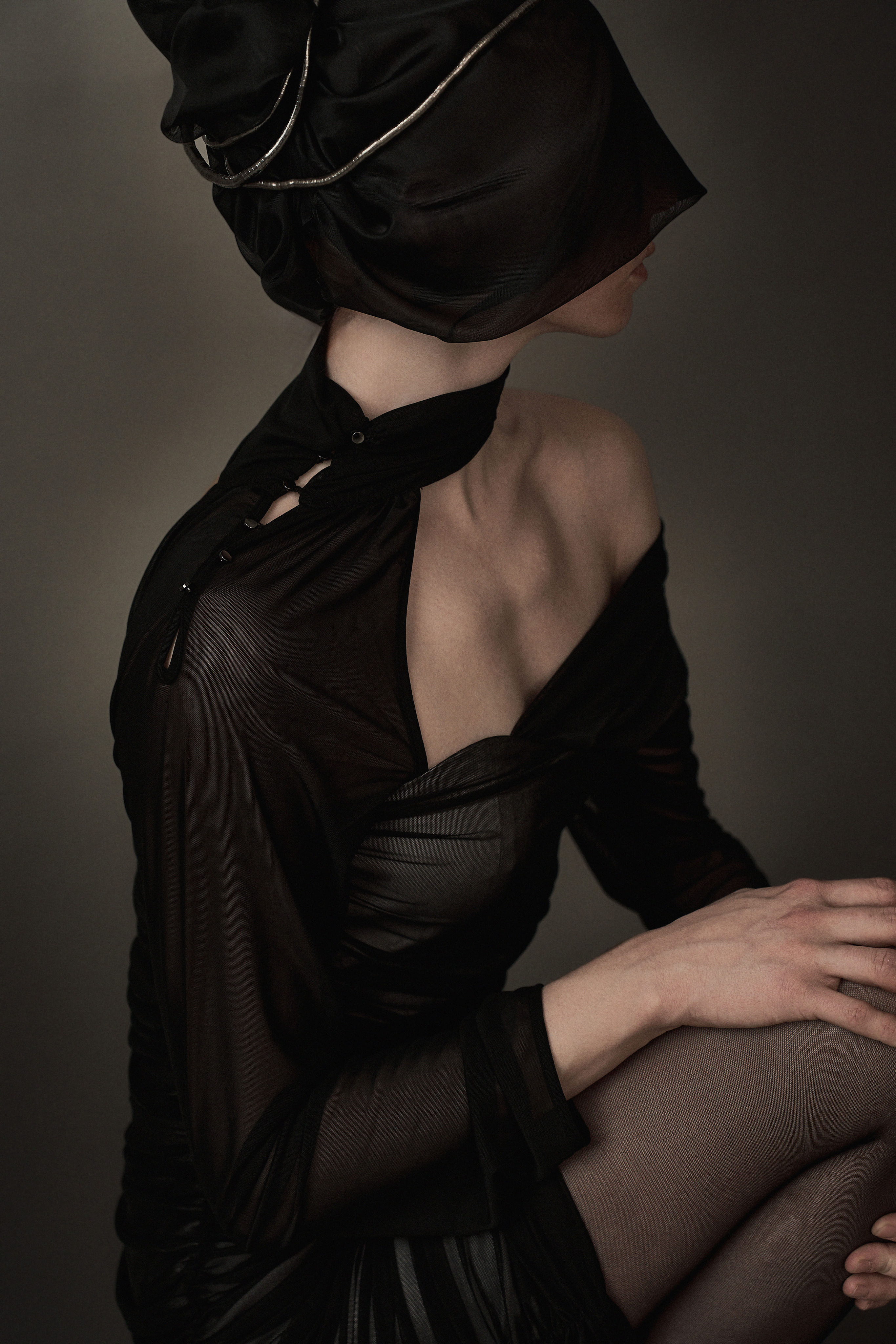 Сложнокроенное платье из двух слоев, снизу – футляр из нежного сатина по фигуре, сверху – драпированная полупрозрачная сетка, создающая воздушный визуал.