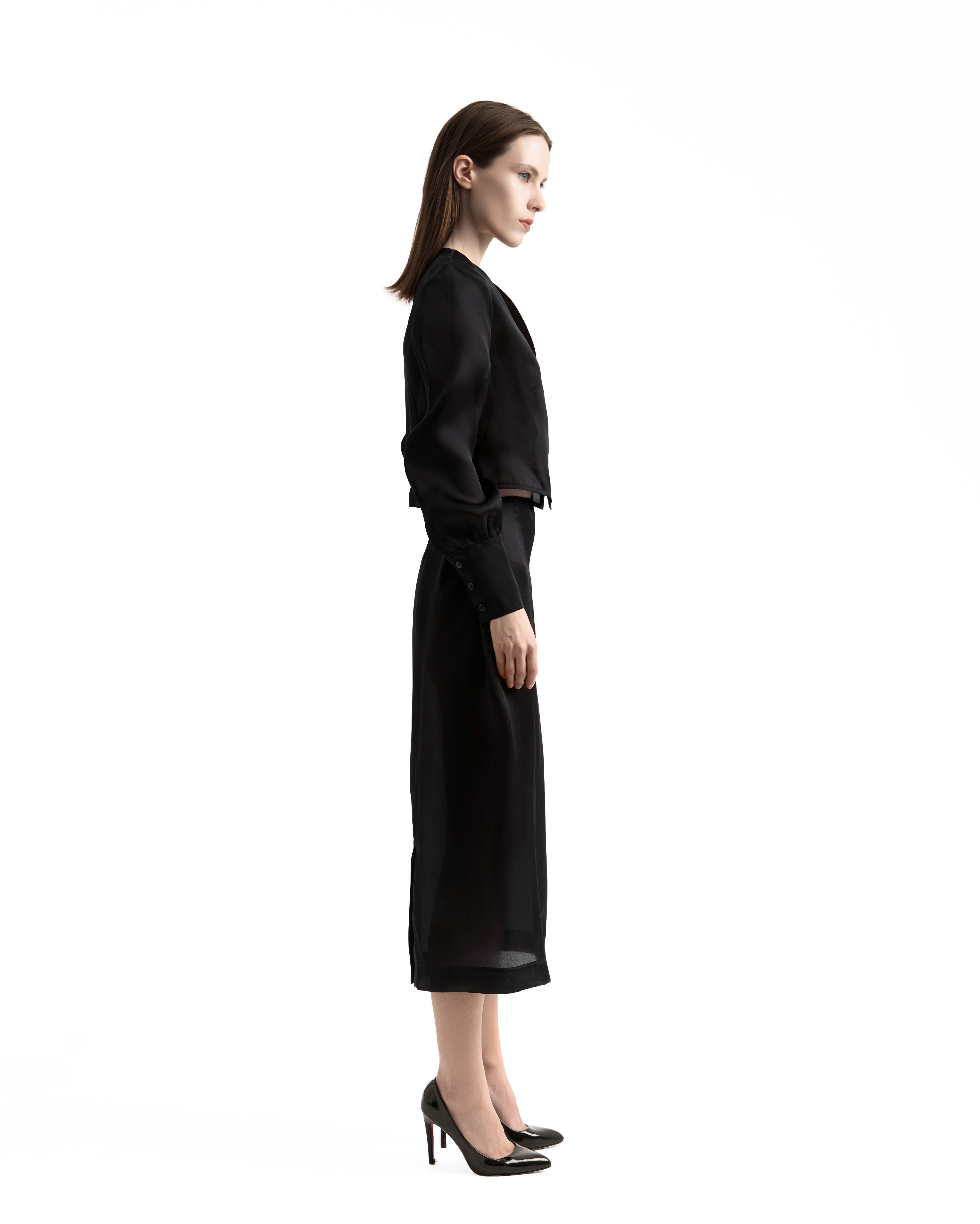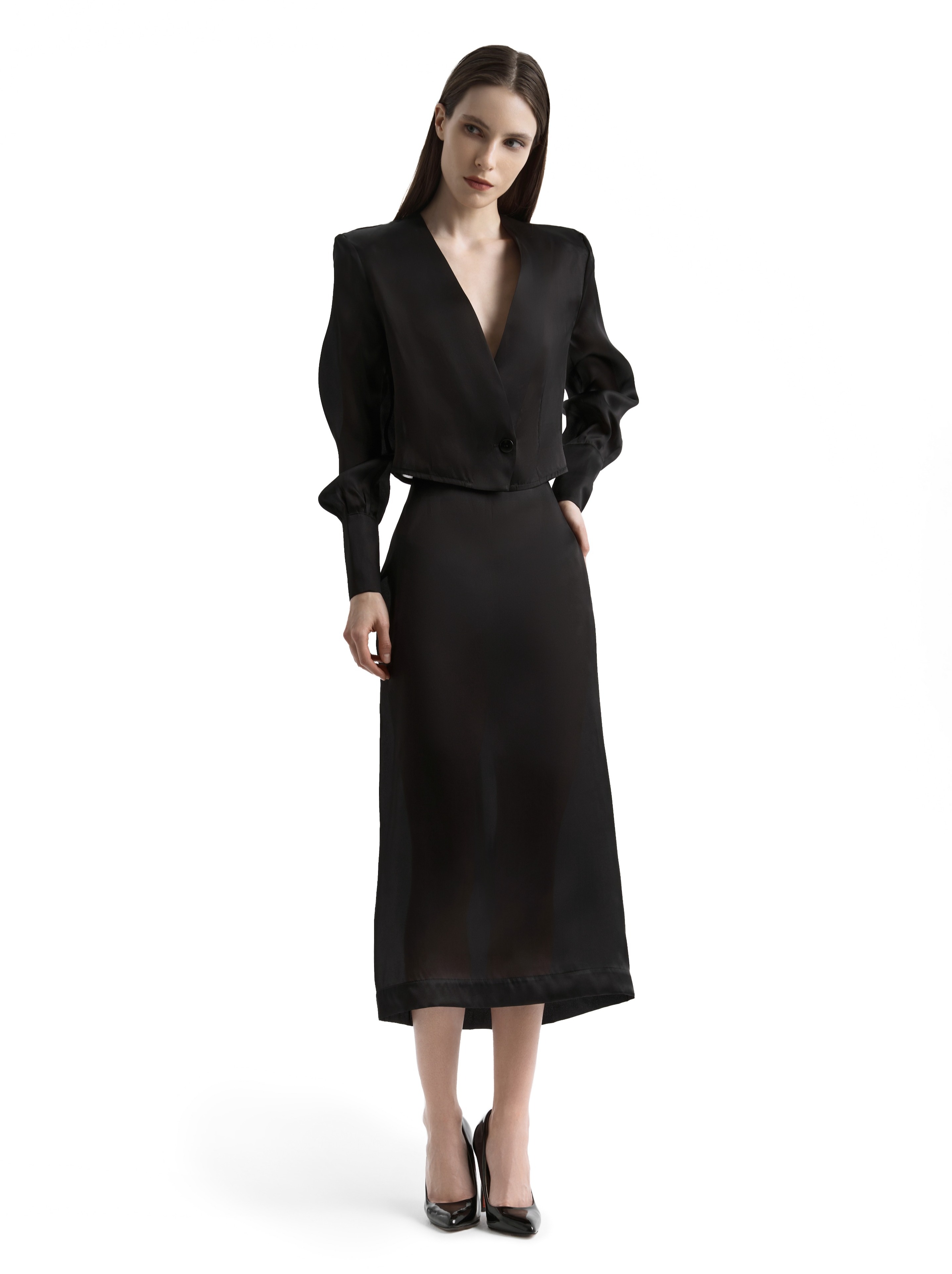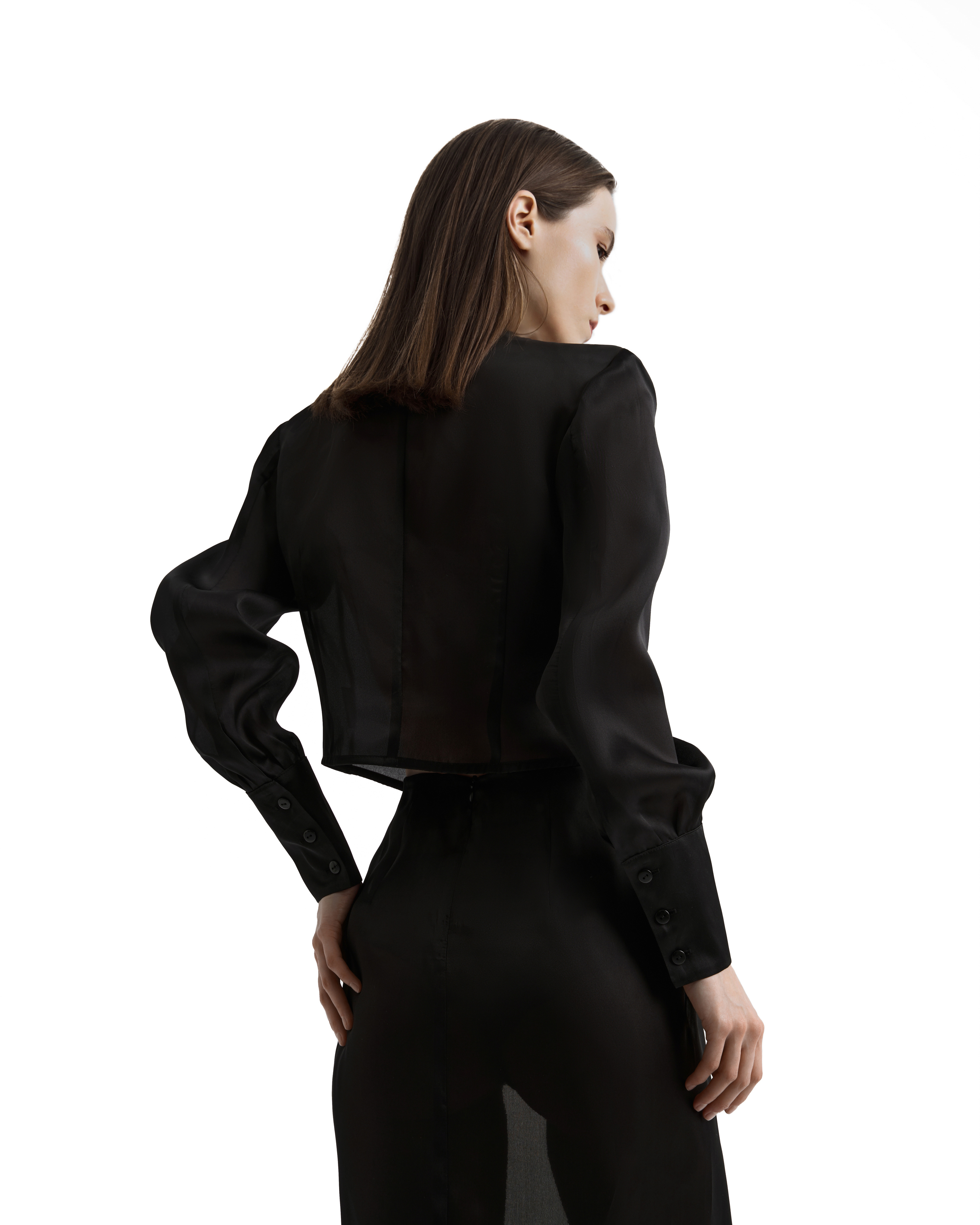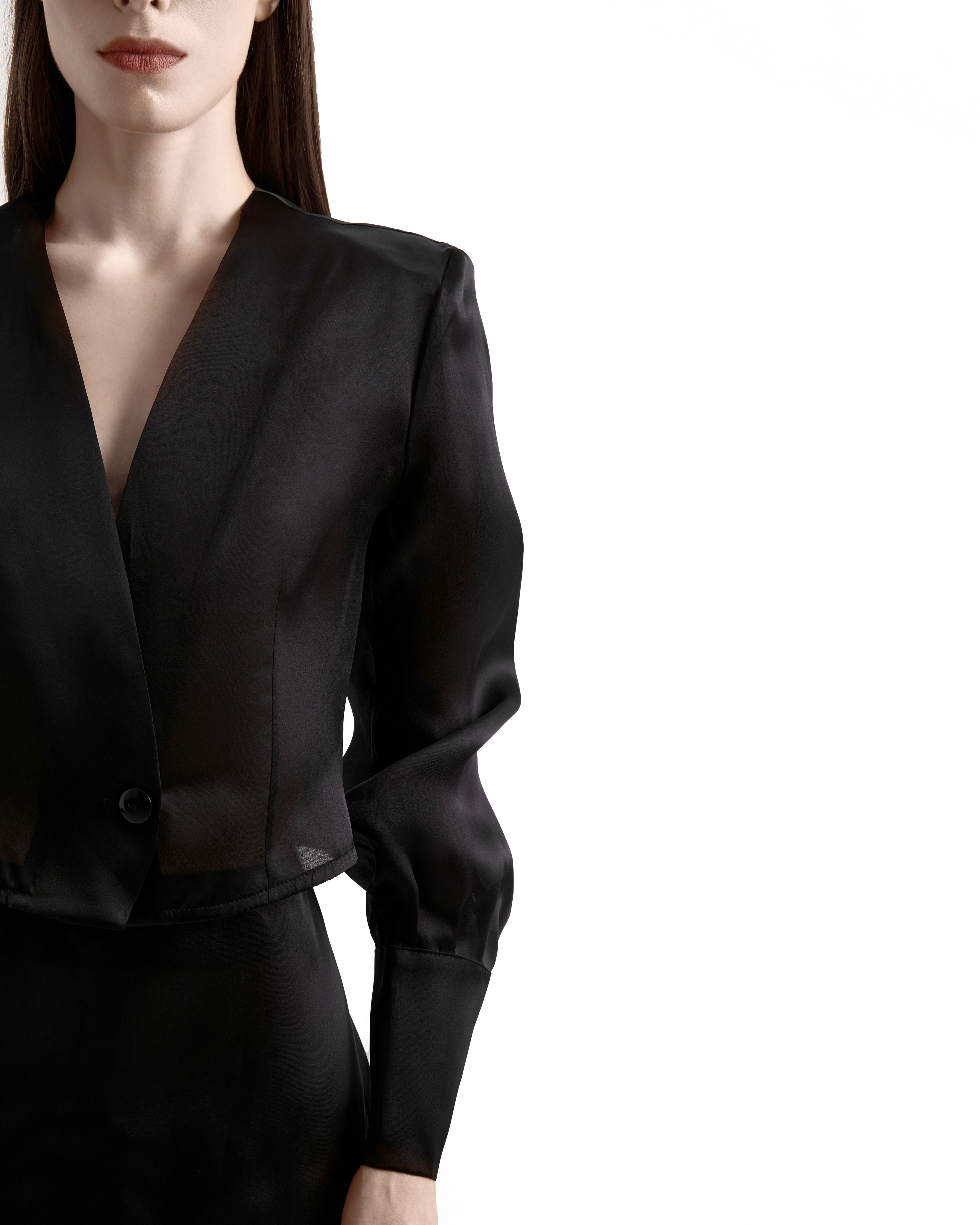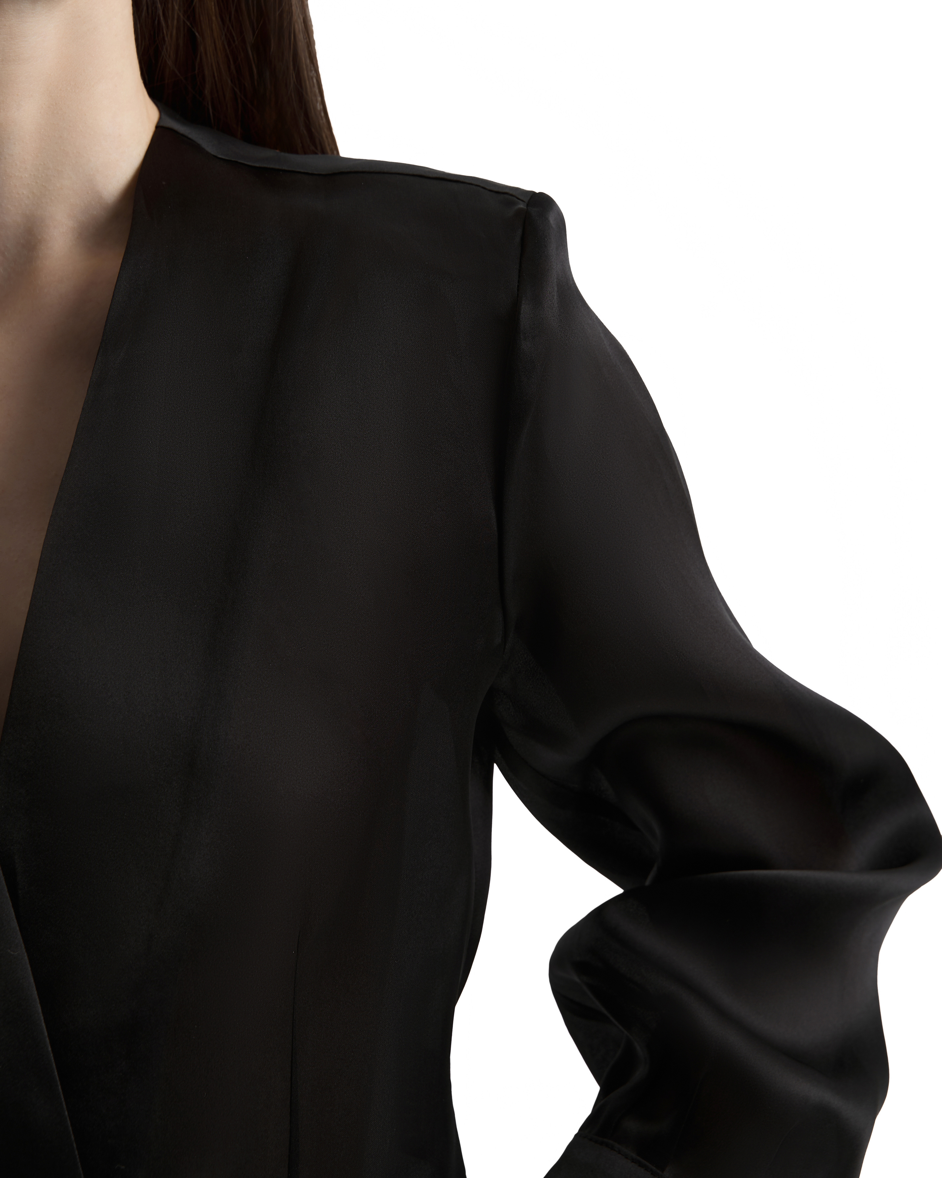 Полупрозрачная шелковая органза, ложащаяся градиентной вуалью на теле. Чем ближе к телу – тем плотнее ткань, чем меньше прилегания – тем больше просвечивание. В разном освещении дает большую или меньшую плотность.