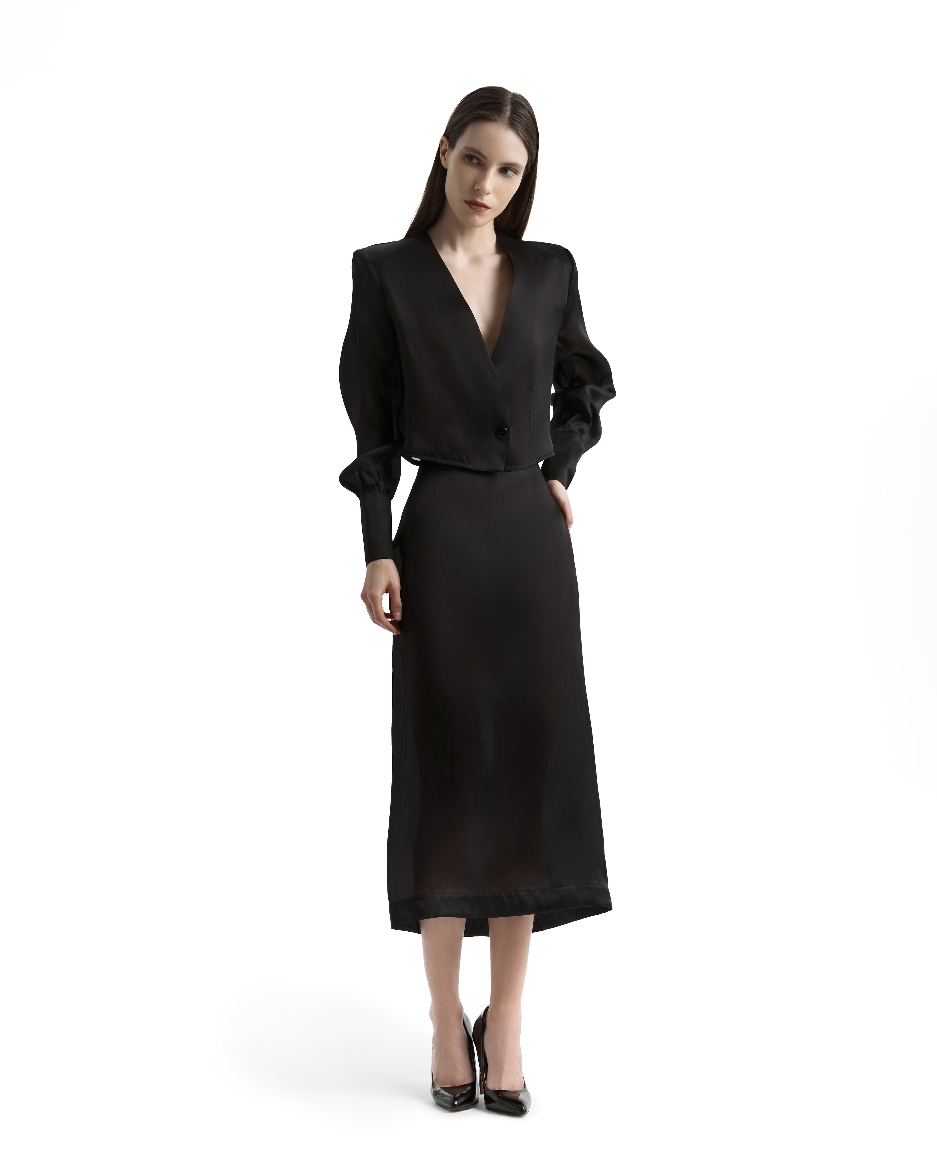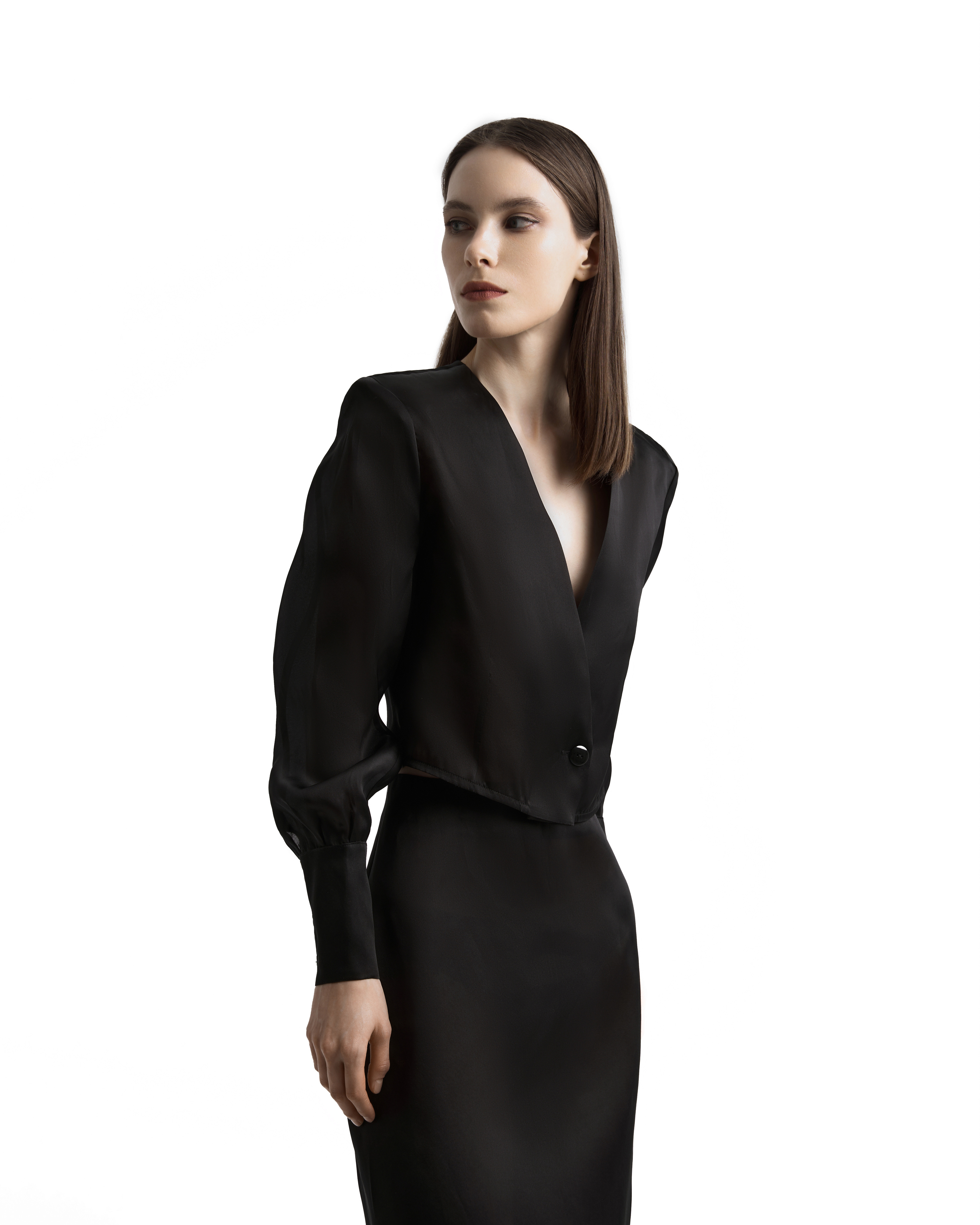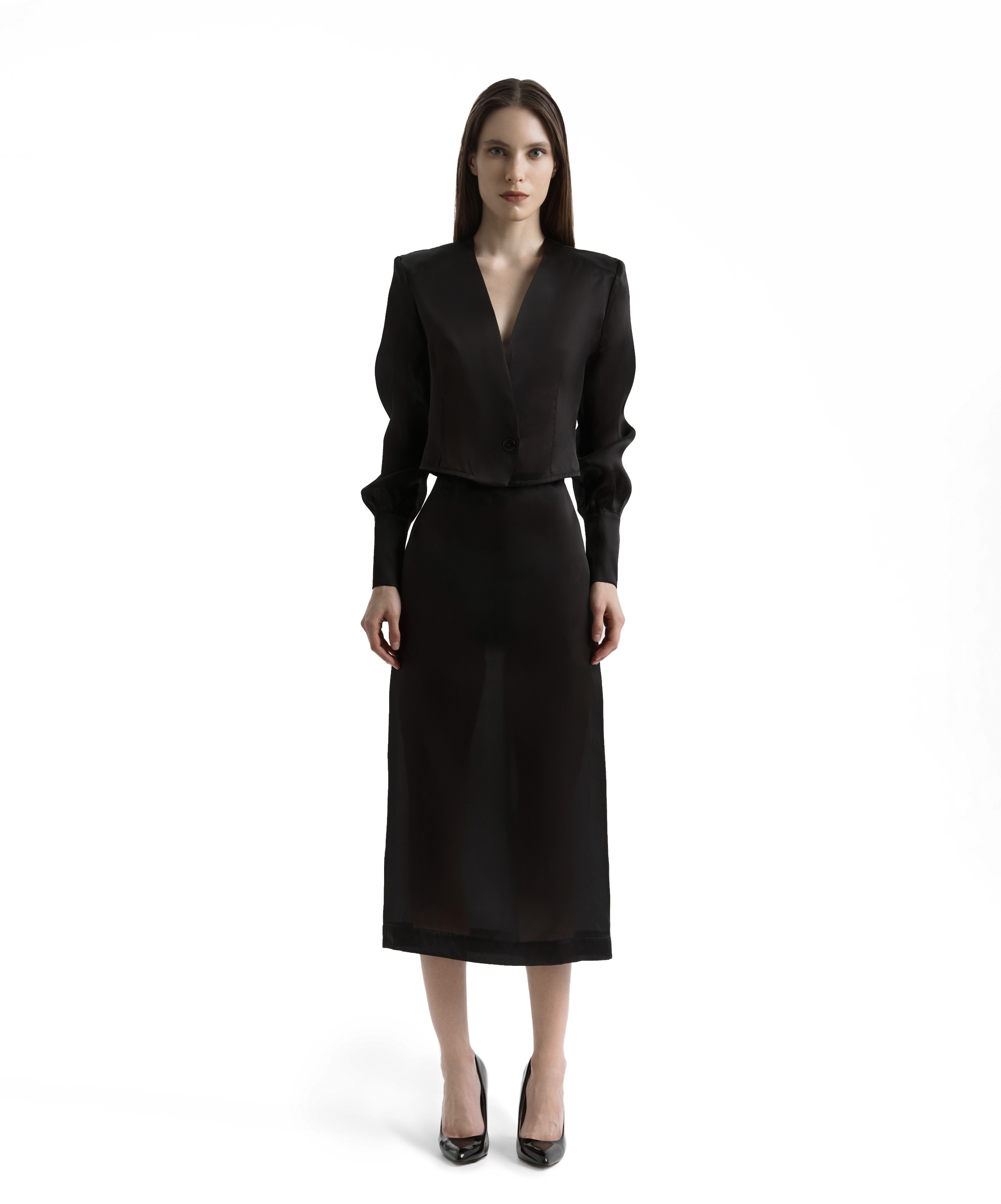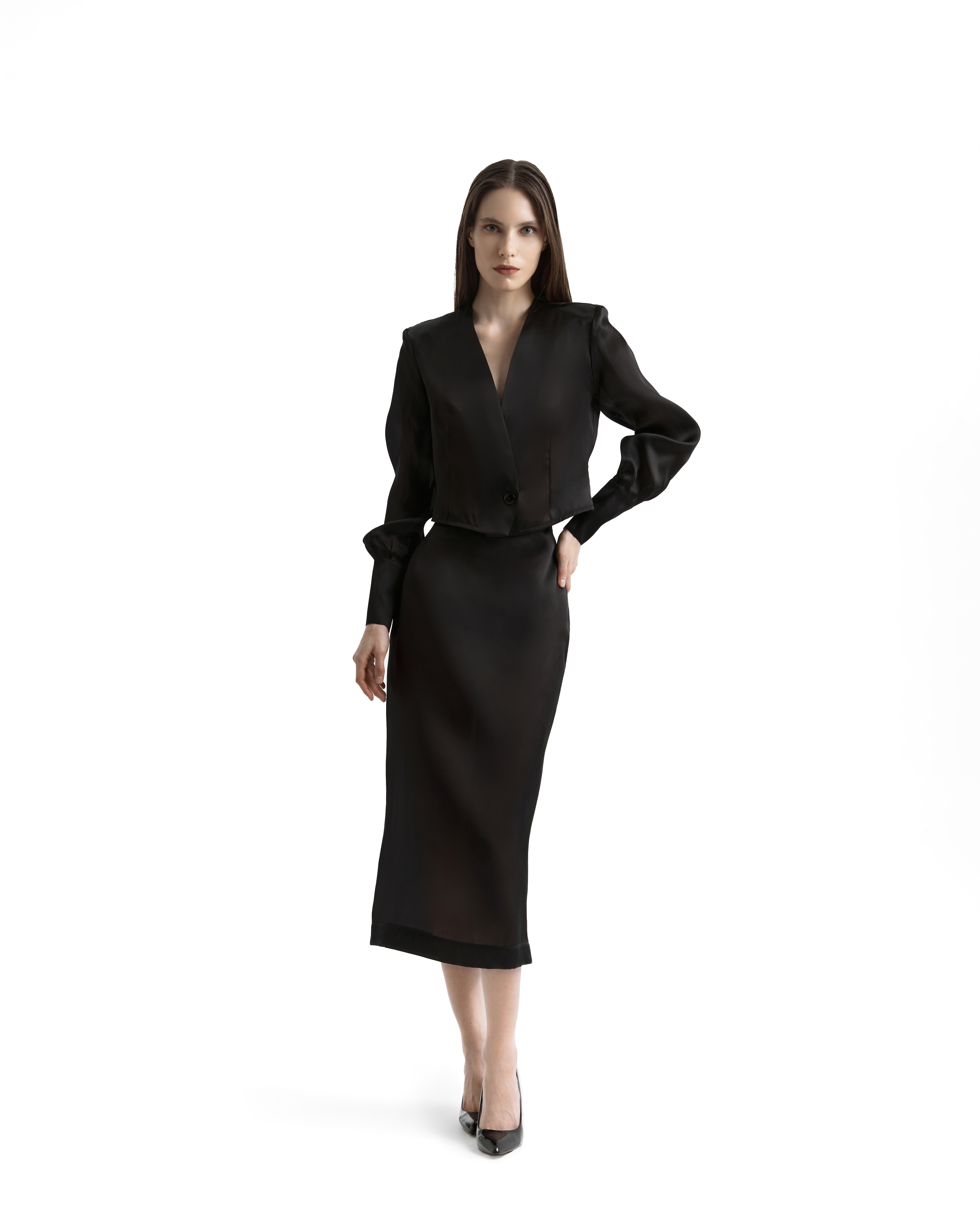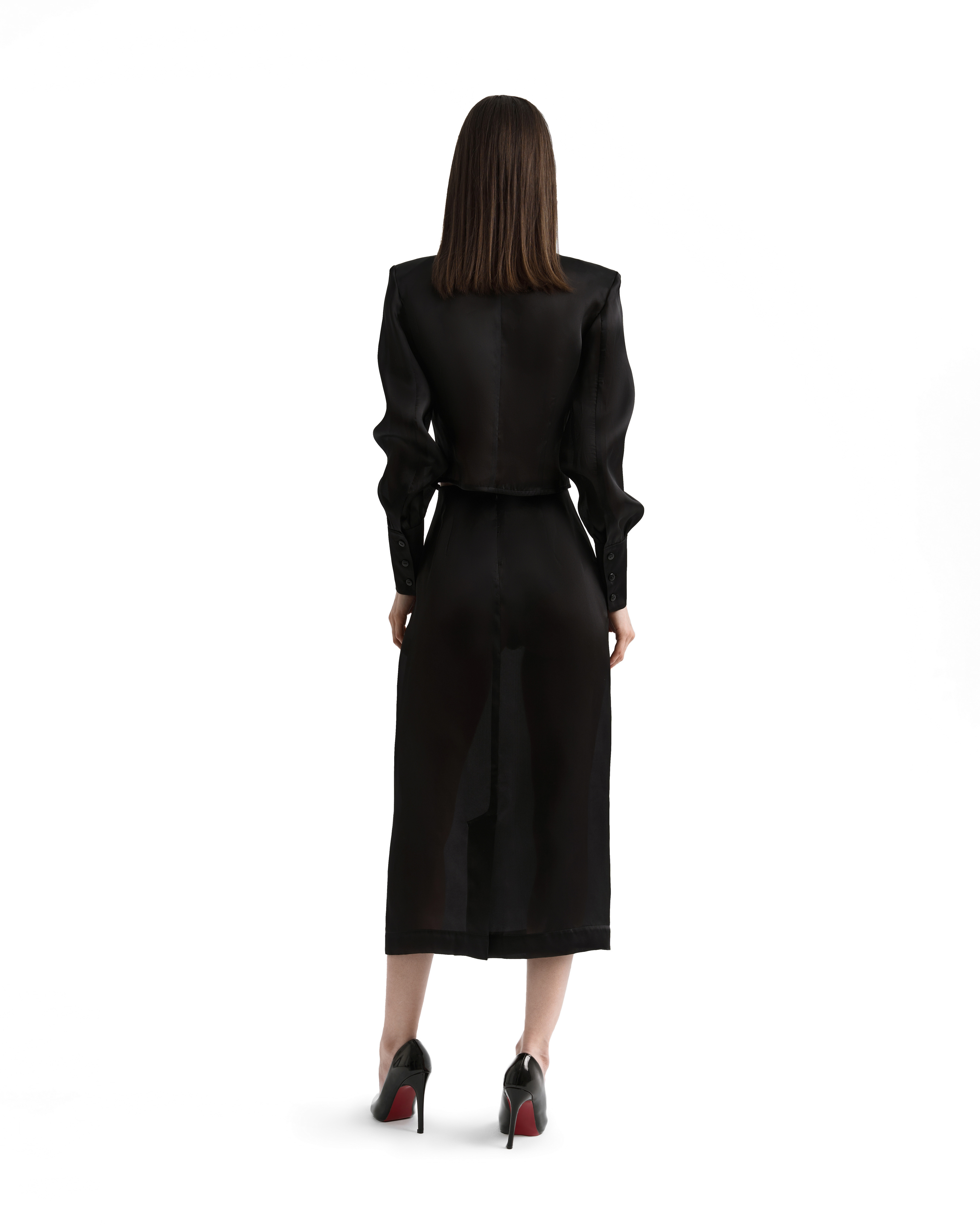 Полупрозрачная шелковая органза, ложащаяся градиентной вуалью на теле. Чем ближе к телу – тем плотнее ткань, чем меньше прилегания – тем больше просвечивание. В разном освещении дает большую или меньшую плотность.