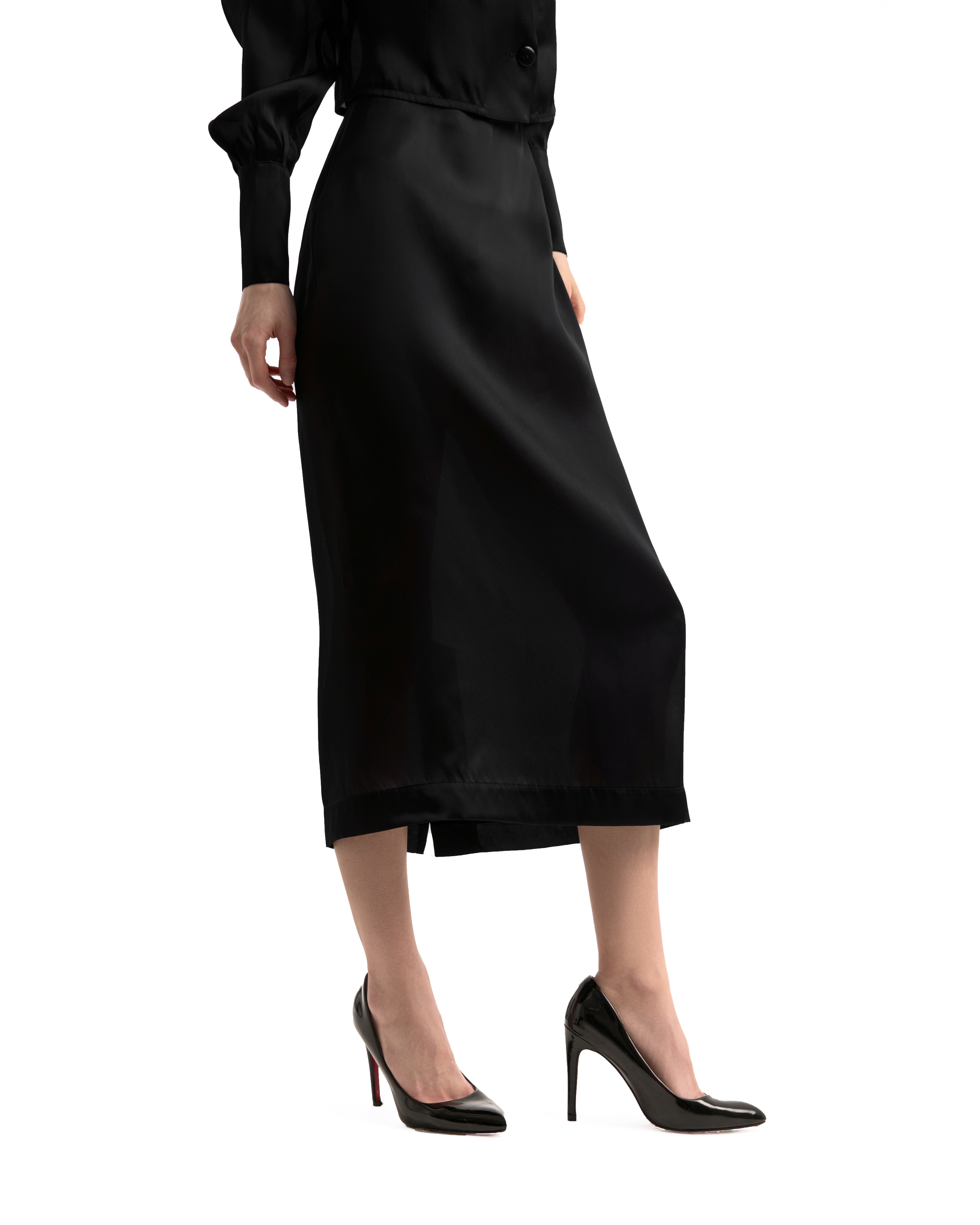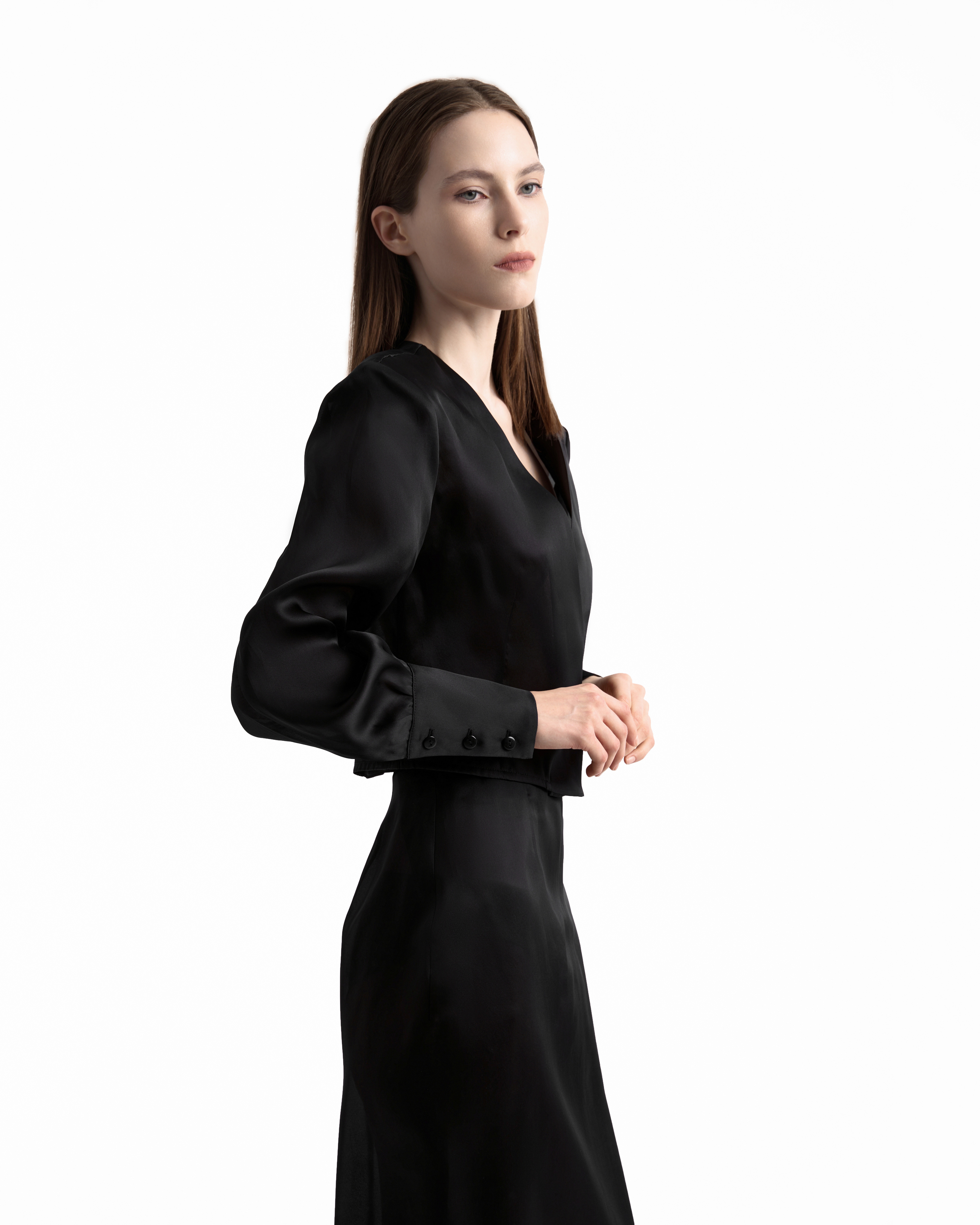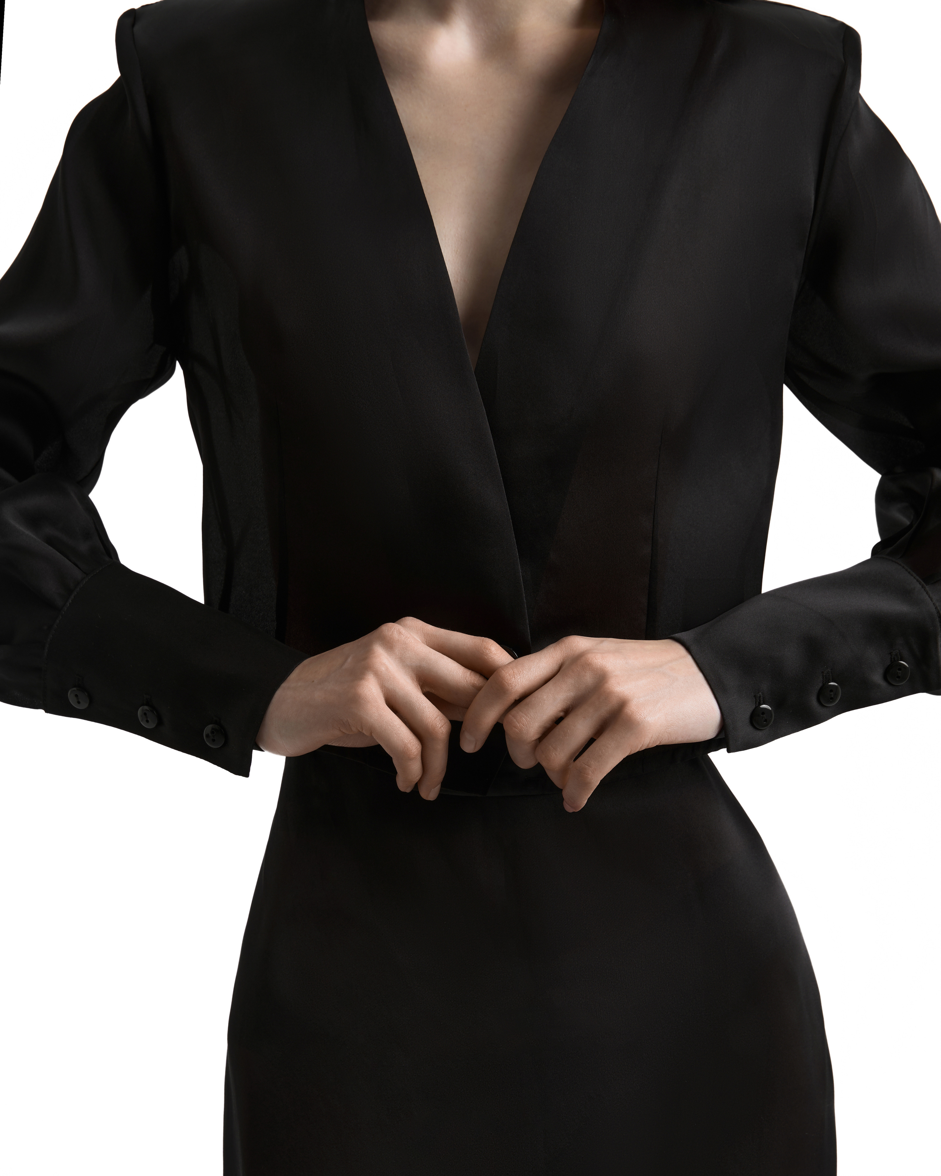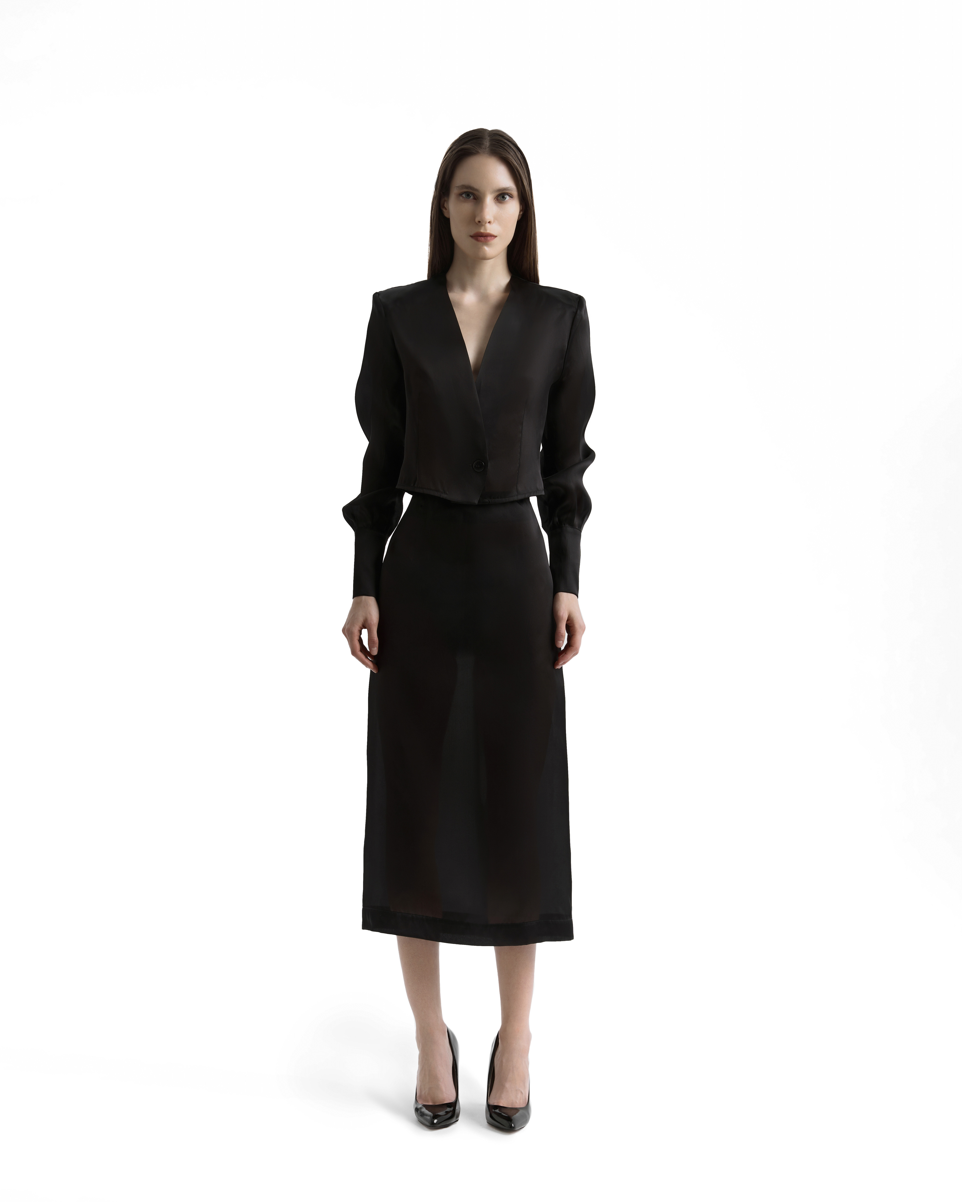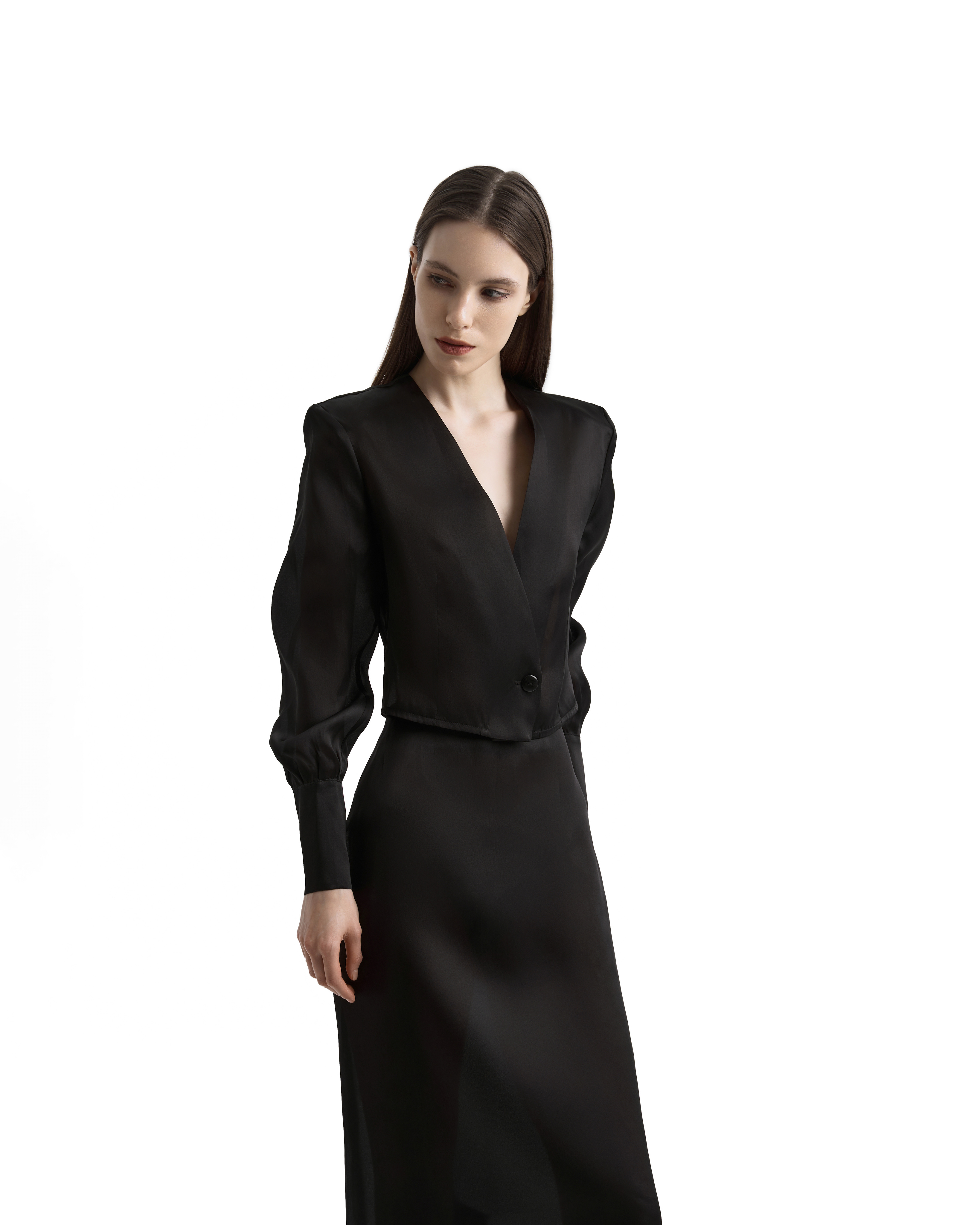 Полупрозрачная шелковая органза, ложащаяся градиентной вуалью на теле. Чем ближе к телу – тем плотнее ткань, чем меньше прилегания – тем больше просвечивание. В разном освещении дает большую или меньшую плотность.